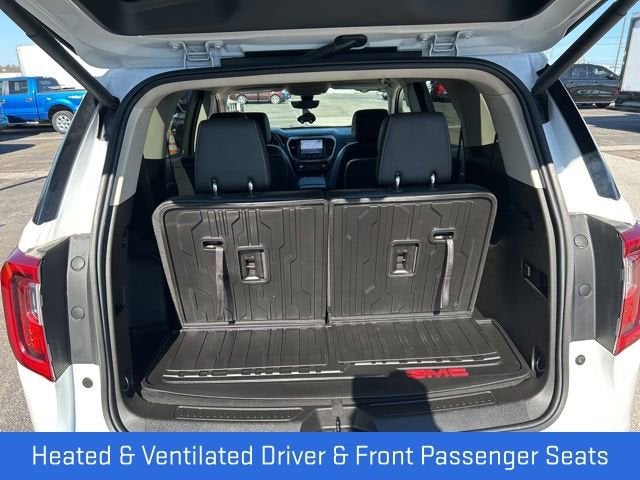 Stepping inside, you'll be greeted by the Acadia's premium Denali-exclusive interior, featuring perforated leather-appointed seating, heated and ventilated front seats, and a heated steering wheel. The 8-way power driver and passenger seats, along with the power lumbar controls, ensure exceptional comfort and support.